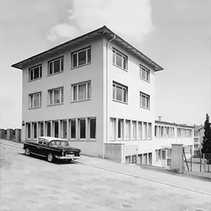 1953 Die bisherigen Räumlichkeiten in der Hohenzollerstraße in Pforzheim wurden bald zu klein. 1953 erfolgte der Umzug in ein eigenes Gebäude in der Bayerstraße. In den folgenden Jahren wurde das Gebäude kontinuierlich erweitert.