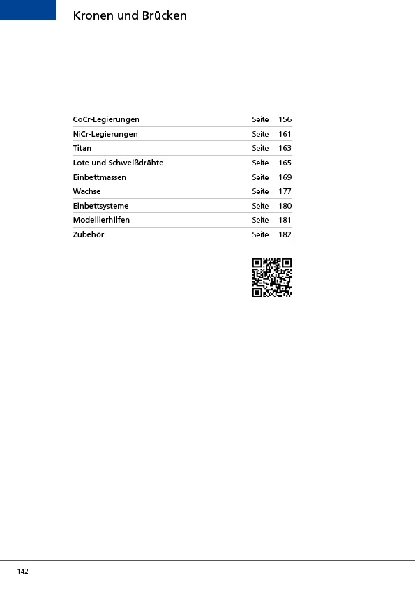 142 Kronen und Brücken CoCr-Legierungen Seite 156 NiCr-Legierungen Seite 161 Titan Seite 163 Lote und Schweißdrähte Seite 165 Einbettmassen Seite 169 Wachse Seite 177 Einbettsysteme Seite 180 Modellierhilfen Seite 181 Zubehör Seite 182