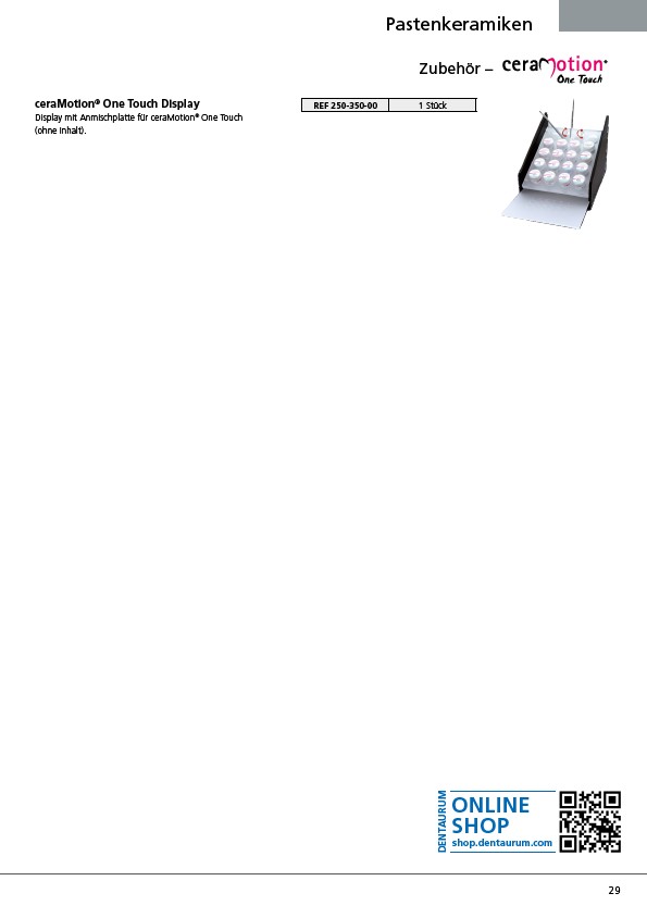 29 Pastenkeramiken Zubehör – ceraMotion® One Touch Display Display mit Anmischplatte für ceraMotion® One Touch (ohne Inhalt). REF 250-350-00 1 Stück DENTAURUM ONLINE SHOP shop.dentaurum.com