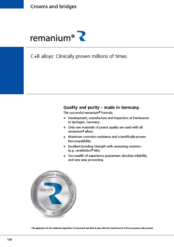 * The application for the trademark registration of remanium® was filed 30 years after the market launch of the non-precious alloy remanit.