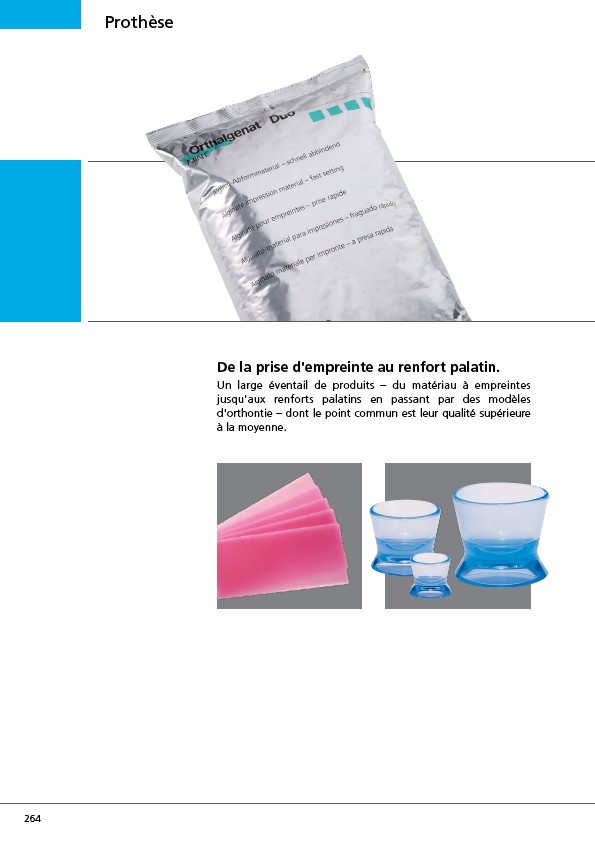 Prothèse 264 De la prise d'empreinte au renfort palatin. Un large éventail de produits – du matériau à empreintes jusqu'aux renforts palatins en passant par des modèles d'orthontie – dont le point commun est leur qualité supérieure à la moyenne.