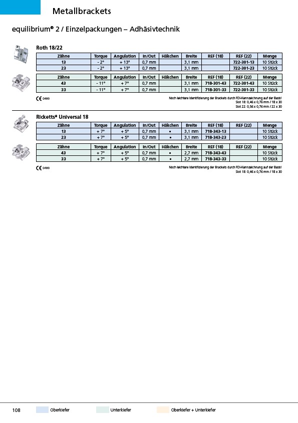Zähne Torque Angulation In/Out Häkchen Breite REF (18) REF (22) Menge
