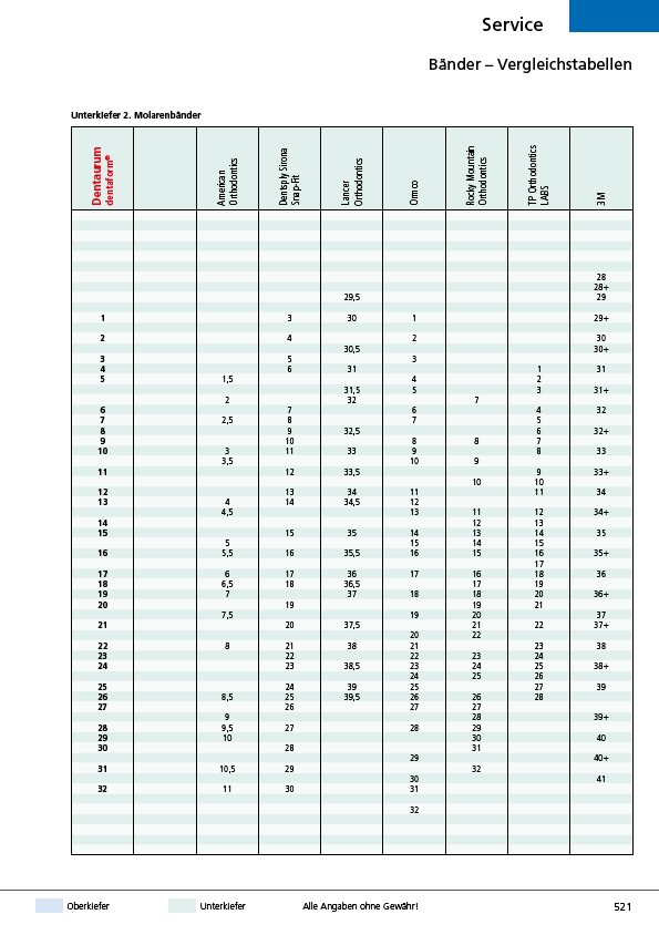 Bänder – Vergleichstabellen