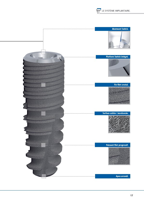 LE SYSTÈME IMPLANTAIRE. 17 Abutment Switch. Platform Switch intégré. Fin filet crestal. Surface sablée / mordancée. Puissant filet progressif. Apex arrondi.