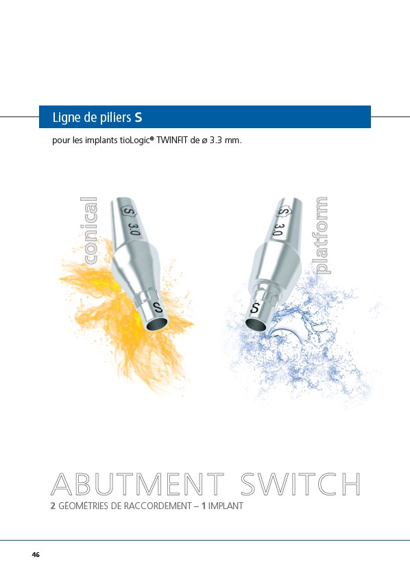 46 Ligne de piliers S pour les implants tioLogic® TWINFIT de ø 3.3 mm. 2 GÉOMÉTRIES DE RACCORDEMENT – 1 IMPLANT