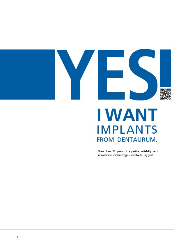 YES I WANT IMPLANTS FROM DENTAURUM. More than 25 years of expertise, reliability and innovation in implantology – worldwide. Say yes! 2